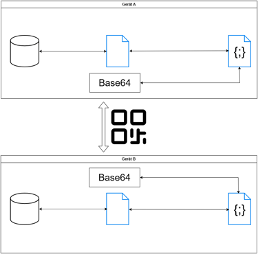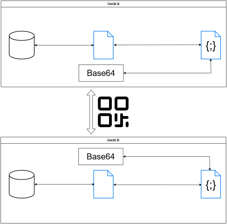 Im ersten Schritt wird das ausgewählte Rezept-Objekt in JSON umgewandelt. Anschließend wird der Text per Base64 kodiert und als QR-Code auf dem Gerät angezeigt.